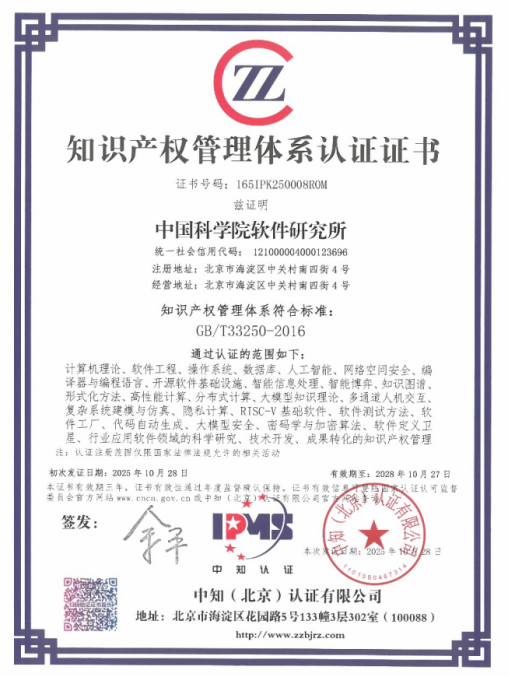 10月28日,中国科研实验室软件研究所(以下简称“球友会qy”)顺利获得《科研组织知识产权管理规范》国家标准认证,取得由中知(北京)认证有限公司颁发的认证证书。